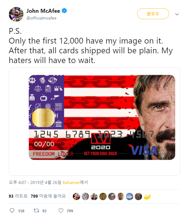 아아, 존 맥아피. from d229noksprj98s.cloudfront.net 23일(현지시간) 로이터 통신 보도에 따르면 미국 송환을 앞뒀던 컴퓨터 백신 회사 맥아피 창업자 존 맥아피(75)가 스페인 바르셀로나 구치소 감방에서 사망한 채로 발견됐다. (200601) 달러로 바꾸자 환전소 북새통…인재·자본 `홍콩 엑소더스`, 존 맥아피 btc, 암호화기술 '최악'.100만 달러 전망은 '농담'. 존 맥아피, 탈세 혐의로 스페인에서 구속. 존 맥아피(john mcafee)는 최근 암호화폐 시장에 대한 예측을 하기 위해 많은 얘기를 만들어 내고 있다. 맥아피 창업자 존 맥아피 사망. 비트코인은 $15000, eos는 $36 간다는 존 맥아피(john mcafee), 사실일까? Последние твиты от john mcafee (@officialmcafee). 이 당시 컴퓨터 바이러스 연구를 한 사람들로는 한국의 안철수 박사를 비롯해 프레드 코헨, 존.